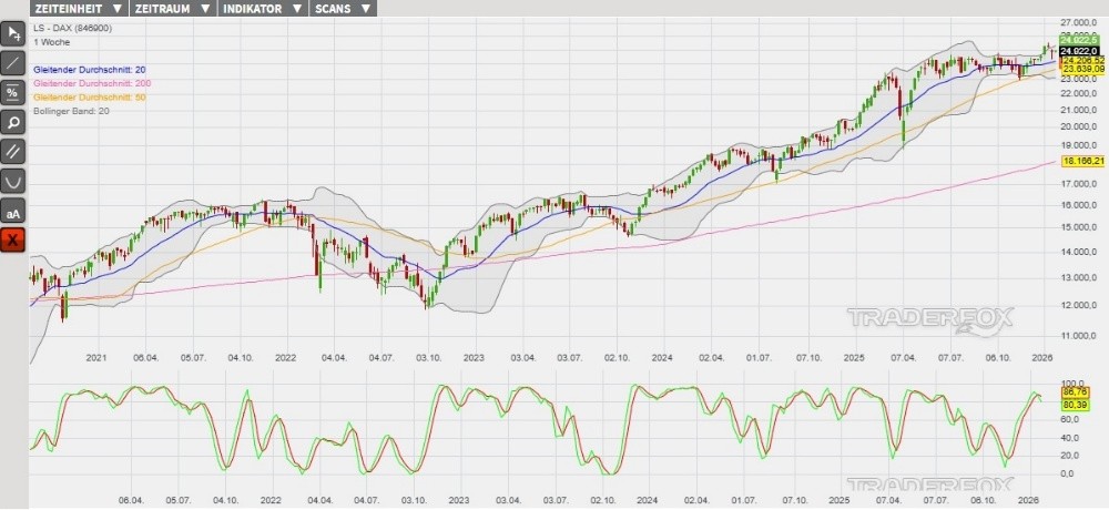 Im laufenden Börsenjahr 2026 konnte der DAX den langfristigen Aufwärtstrend bis zum 13. Januar auf neue Höchststände ausweiten. Anschließend wurde eine technische Gegenreaktion zum Abbau der überkauften Marktlage eingeleitet. Hierbei konnte am 21. Januar ein neues Verlaufstief markiert werden, welches als Sprungbrett für eine neue Aufwärtswelle genutzt wurde. Charttechnisch konnte der DAX dadurch bereits eine Erholungsbewegung zum gleitenden Durchschnitt der letzten 20 Börsentage (= GD 20) absolvieren. Sollte der gleitende Durchschnitt nachhaltig überwunden werden, dann könnte das entstehende Kaufsignal weitere Kursanstiege bis zum oberen Bollinger-Band begünstigen. Derzeit weisen bereits die gleitenden Durchschnitte der letzten 50 sowie 200 Börsentage (= GD 50 sowie GD 200) und die Slow Stochastik Kaufsignale aus.