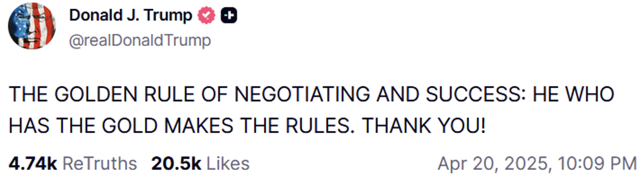 Ob die Panik vor dem Konfiszieren der deutschen Goldreserven durch die Trump-Administration eher ins Reich der Märchen oder Memes gehört, darüber lässt sich sicher streiten. Andererseits befeuert der US-Präsident genau solche Reflexe, wie das im letzten April über seine Social Media veröffentlichte "Menetekel" zeigt: