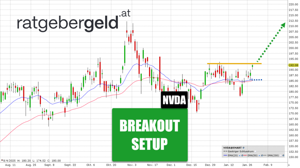 Scheitert NVIDIA erneut an der 192 USD-Hürde, könnten wir einen Test der Unterstützung im Bereich von 177.50 oder sogar 170 USD sehen. Eine Absicherung der Position unter der 20-Tagelinie würde das Rückschlags-Risiko minimieren.