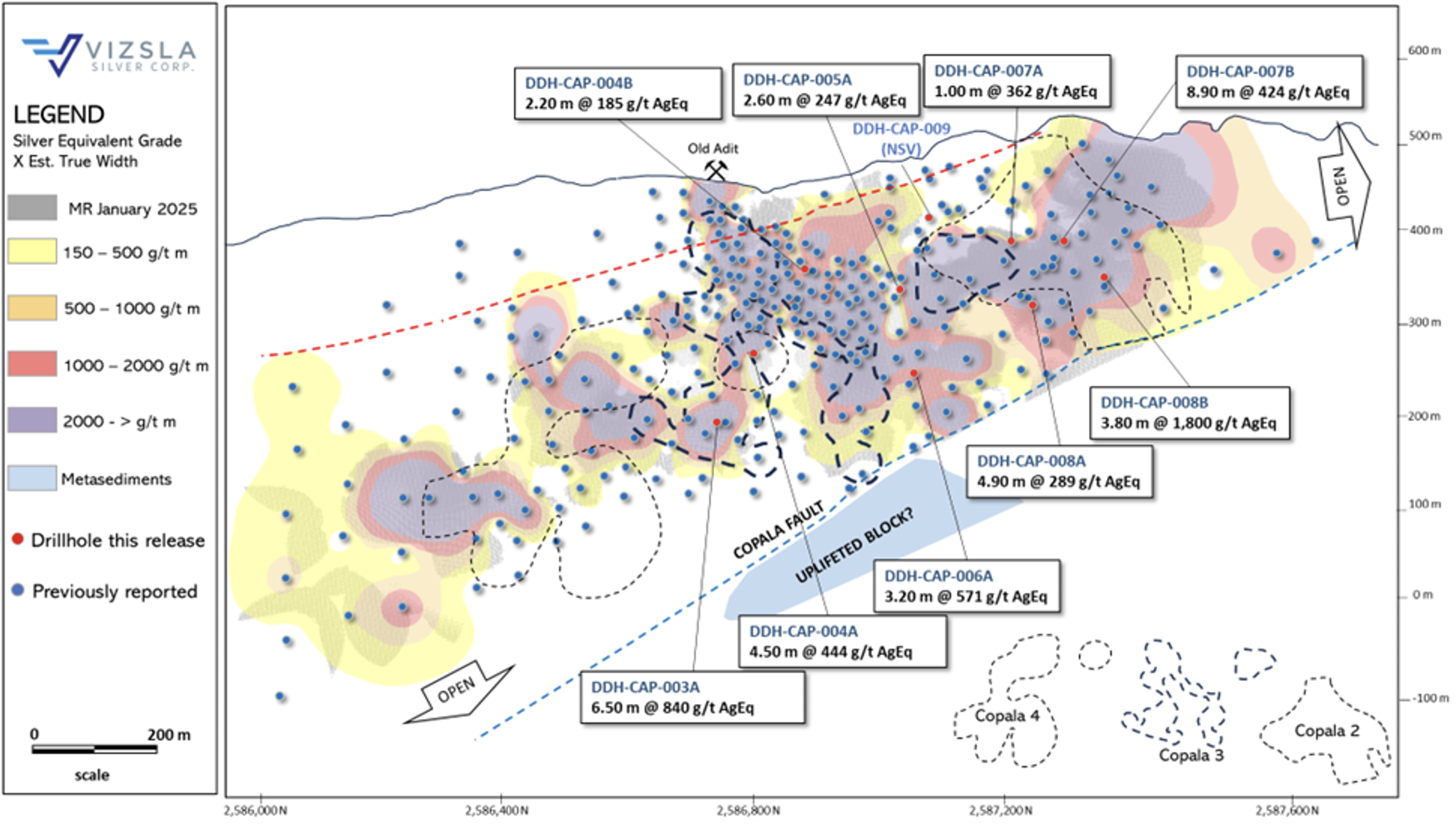So lieferte Bohrung DDH-CAP-008B satte 1.800 g/t Silberäquivalent (AgÄq) (1.284 g/t Ag und 7,51 g/t Au) über 3,80 m tatsächliche Mächtigkeit, inklusive 3.833 g/t AgÄq (2.760 g/t Ag und 15,70 g/t Au) über 0,93 m, Bohrloch DDH-CAP-003A wiederum förderte fette 840 Gramm g/t AgÄq (681 g/t Ag und 2,58 g/t Au) über 6,50 m zutage, einschließlich 1.219 g/t AgÄq (1.046 g/t Ag und 3,10 g/t Au) über 0,91 m und 1.708 g/t AgÄq (1.428 g/t Ag und 4,77 g/t Au) über 1,83 m. Wohlgemerkt ist das nur ein kleiner Ausschnitt aus diesem bombastischen "Best-of' der geotechnischen Bohrlöcher.