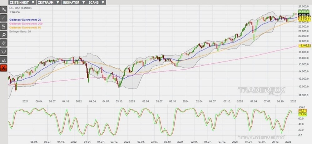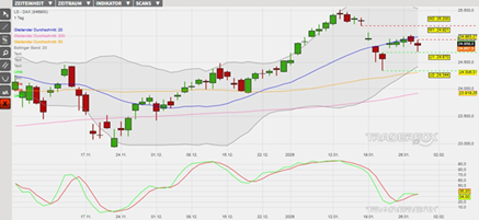 Charttechnisch könnte der DAX die eingeleitete Abwärtsbewegung der letzten beiden Tage heute in Richtung des Tageshochs vom 21. Januar bei 24.670 Punkten (Unterstützung 1) ausweiten. Durch die Berührung dieser Kursmarke würde wiederum eine noch offene Kurslücke geschlossen werden. Anschließend könnte sich die Abwärtsbewegung in Richtung des unteren Bollinger-Bandes und bis zum Tagestief vom 21. Januar bei 24.344 Punkten (Unterstützung 2) ausweiten. Als eine Anlagemöglichkeit in den DAX stehen verschiedene derivative Produkte zur Verfügung. Ein Beispiel ist der ENDLOS TURBO SHORT 27.984,66 OPEN END: BASISWERT DAX der DZ BANK (WKN: DU68X7)* mit einem Basispreis von 27.984,66 Punkten. Der Hebel liegt am 29.01.2026 um 07:00 Uhr bei 7,94. Das Short-Szenario ist hinfällig, wenn der DAX über die Marke von 25.200 Punkten (Widerstand 2) steigt. Bitte beachten Sie die Produktrisiken, welche unten im Dokument beschrieben sind.