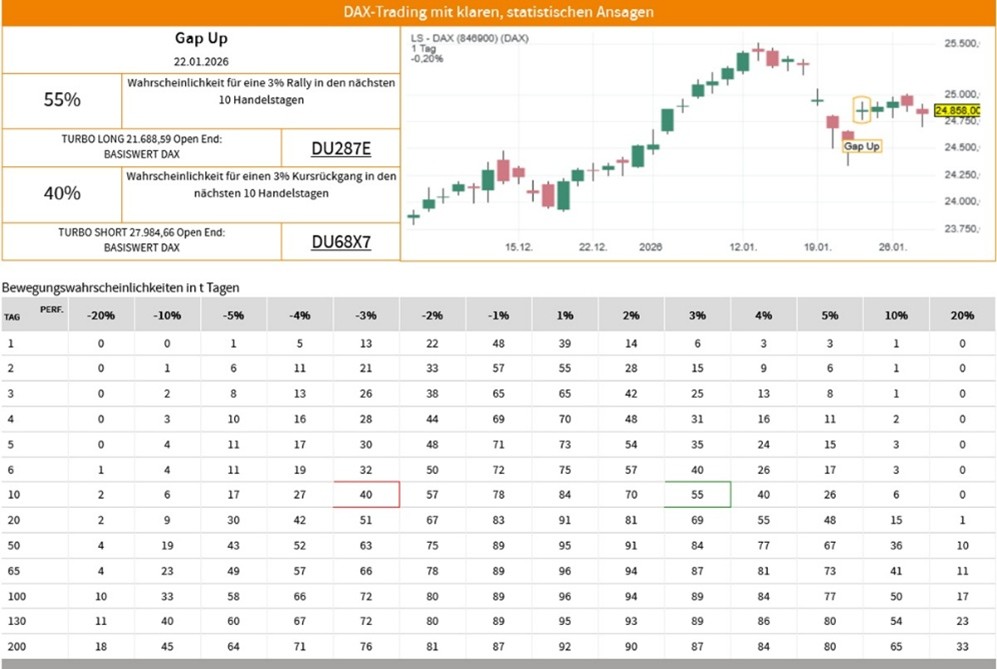 Die Erfolgswahrscheinlichkeiten für das Signal "Gap Up" beruhen auf einer historischen Auswertung des Signals auf den LS-DAX im Zeitraum vom 02.01.2000 bis zum 28.01.2026. Dabei wurden die folgenden Voreinstellungen und Filter vorgenommen: