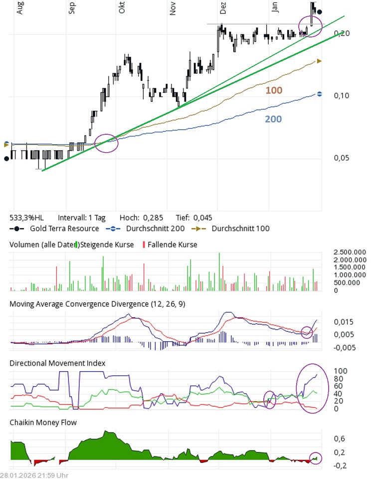 ?Der Sechsmonatschart des kanadischen Goldexplorers Gold Terra Resource (TSXV: YGT, OTCQX: YGTFF, FRA: TX0) zeigt seit dem Sommer eine stetige und sehr starke Aufwärtsbewegung oberhalb der grünen Trendlinie. Nach einer Verdreifachung des Aktienkurses innerhalb weniger Monate begann im Dezember eine Seitwärtsphase, die um die Marke von 0,20 kanadischen Dollar herum oszillierte. Vor einer Woche konnte dieser "Deckel" gesprengt werden und die nächste Stufe der Aufwärtsbewegung startete.