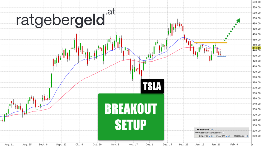 Tesla befindet sich nach einer Korrektur von den Dezember-Hochs (nahe 500 USD) in einer Konsolidierungsphase. Die Marke um 452 bis 454 USD fungiert als harter Deckel.