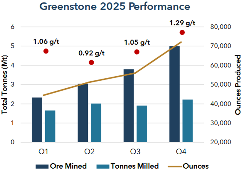 Die unter Darren Halls Führung umgesetzten operativen Verbesserungen haben im zweiten Halbjahr des vergangenen Jahres einen klaren Niederschlag gezeigt. So verbuchte "Greenstone' in Q4-2025 mit 72.091 Unzen einen Anstieg der Produktion von +29% gegenüber dem Vergleichsquartal 2024, während der Abbau mit 198.000 Tonnen pro Tag +9% gegenüber dem 3. Quartal und 31% gegenüber dem 1. Halbjahr 2025 zulegte.