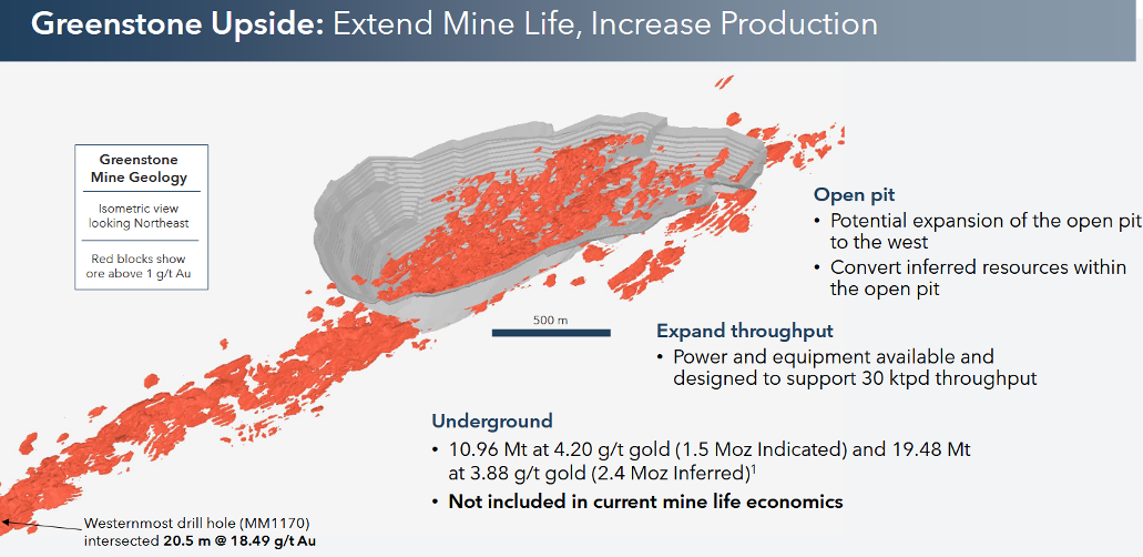 Darüber hinaus bietet "Greenstone' zahlreiche Möglichkeiten, sowohl die Produktion zu steigern als auch die Lebensdauer der Mine zu verlängern. Die Erkundung im Westen und Südwesten deutet auf ein gutes Erweiterungspotenzial der Tagebaugrube hin. Eine große unterirdische Lagerstätte, die im aktuellen Reservelebensplan nicht enthalten ist, könnte zusätzliches Expansionspotenzial bieten.