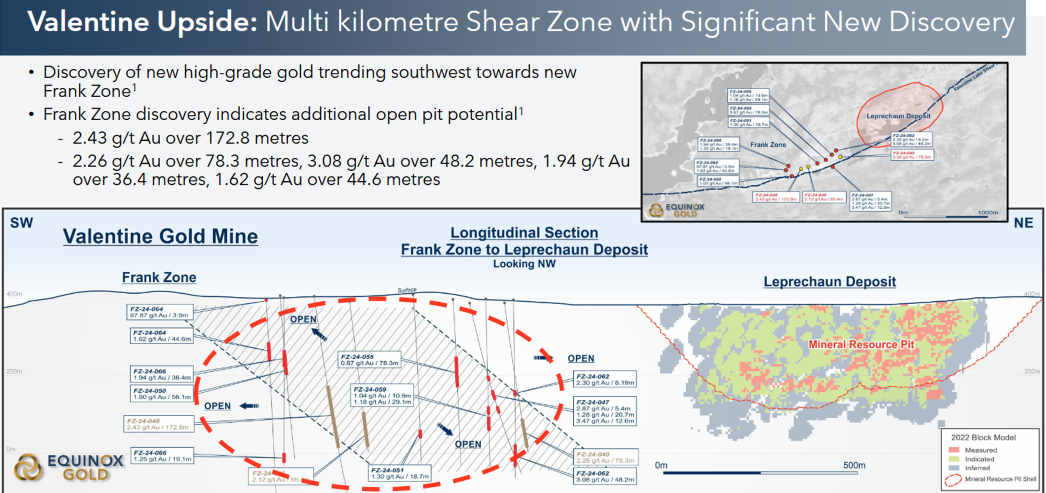 Wie spannend Equinox Gold (WKN: A2PQPG) seine Explorationsmöglichkeiten für das "Valentine'-Projekt sind, zeigt die Entdeckung der "Frank'-Zone, weniger als einen Kilometer westlich jener Tagebauvorkommen, die bereits im aktuellen Minenplan enthalten sind. Hier soll im laufenden Jahr eine "Multi-Rig'-Bohrkampagne fortgesetzt werden, um diesen vielversprechenden 35 km langen mineralisierten Trend weiter zu erforschen.