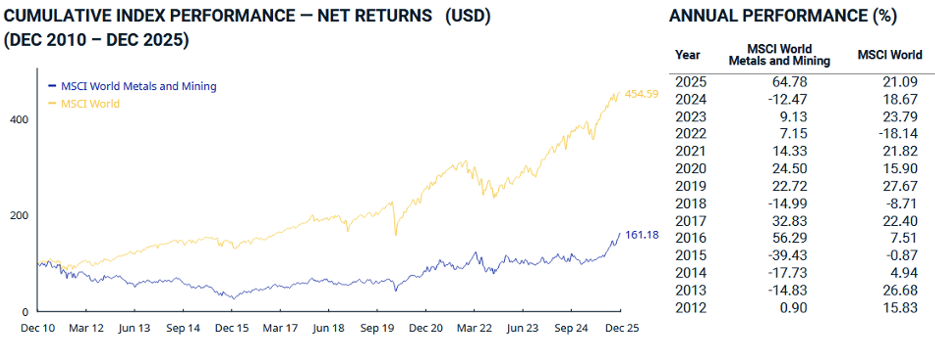Wie attraktiv Goldaktien sind, das zeigt sich unter anderem darin, dass der MSCI Metals and Mining Index mit einem Plus von über 90% seit Anfang 2025 sowohl die Performance von Halbleitern und Banken ebenso wie die der "Magnificent Seven" (Apple, Alphabet, Amazon, Meta, Microsoft, Nvidia und Tesla) weit in den Schatten gestellt hat.