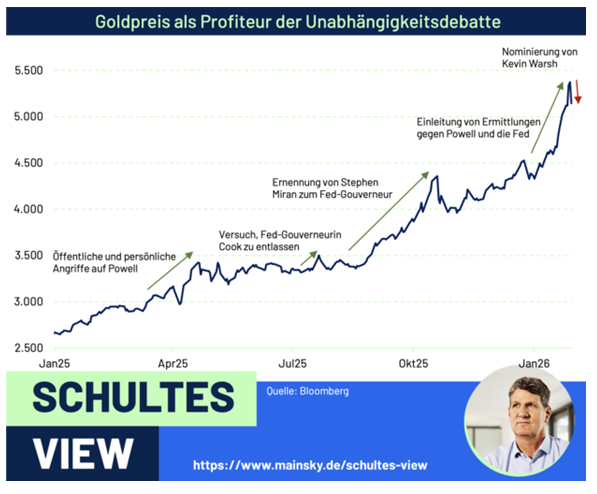 Gewinnmitnahmen im Gold Einer der größten Profiteure dieser Ängste war der Goldpreis. Mit einer Verdopplung seit Trumps Wahl reflektierte dieses Asset wie kein anderes die Angst vor dem Unabhängigkeitsverlust der Fed. Mit der Personalie Warsh sind Gewinnmitnahmen jetzt mehr als überfällig - selbst ein technischer Rücksetzer in Richtung der 4000er-Marke würde den langfristigen Aufwärtstrend noch nicht gefährden.