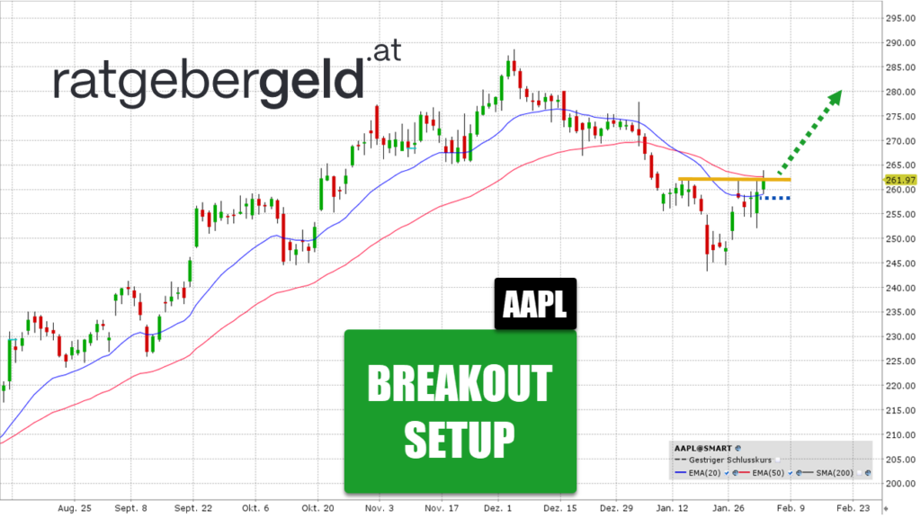 Apple hat erst vor wenigen Tagen (29. Januar) Zahlen für das erste Quartal vorgelegt. Dabei wurden massive neue Bestmarken bei Umsatz und Gewinn, getrieben durch das iPhone 17 und das wachsende Dienstleistungsgeschäft erzielt. Für das laufende Q2 2026 erwartet das Management ein Umsatzplus von 13 % bis 16 %. Apple bleibt ein Qualitätswert mit starkem Ökosystem und KI-Fantasie für 2026. Charttechnisch befindet sich die Aktie in einer Entscheidungsphase.