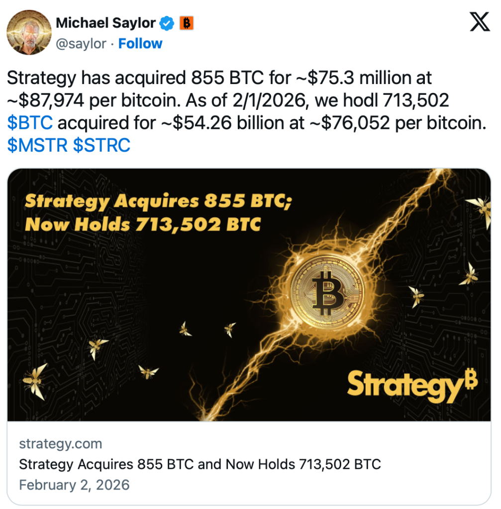 Insgesamt hält Strategy nun 713.502 Bitcoin, die für rund 54,26 Milliarden US-Dollar erworben wurden. Der gewichtete Durchschnittseinstiegspreis liegt bei etwa 76.052 US-Dollar pro Bitcoin und damit nahe am aktuellen Marktpreis. Zwischenzeitlich rutschte Bitcoin sogar kurzzeitig darunter, was Strategy rechnerisch in eine knappe Position bringt.