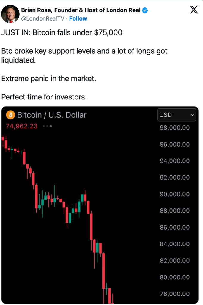 Die Korrektur am Kryptomarkt hat sich zum Wochenende spürbar verschärft. Bitcoin fiel zwischenzeitlich auf rund 75.000 US-Dollar und notiert damit etwa 40 Prozent unter seinem Allzeithoch. Nach einer Phase kontrollierter Rücksetzer gewinnt die Abwärtsbewegung nun deutlich an Dynamik. Der Verkaufsdruck steigt, das Marktumfeld bleibt hoch angespannt. In den kommenden Tagen werden mehrere Entwicklungen entscheidend dafür sein, ob Bitcoin eine Stabilisierung schafft oder ob die Schwächephase weiter andauert.