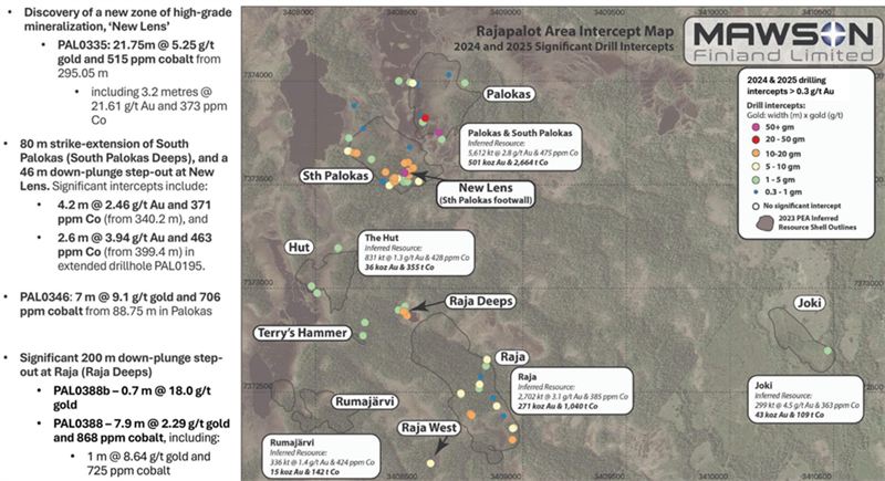 Figure 2. Map of the Rajapalot project illustrating significant Au-Co drilling intercepts from the previous 2024 and 2025 drilling programs by Mawson Finland Limited.