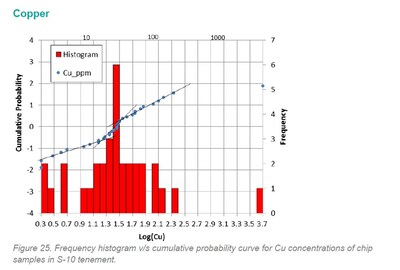 - Histogram (statistical) analysis of the Copper Samples from the 2010-12 drilling shows encouraging signs for the potential for a Porphyry-Copper deposit, with no drilling below 300m vertical and 4 holes ending in copper mineralization (0.1-0.3% Cu).