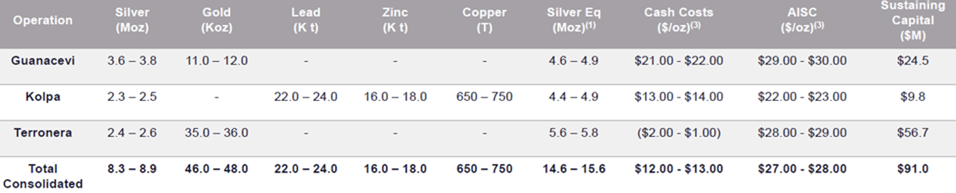 Im Detail sieht die aktualisierte Prognose vor, dass "Terronera', "Guanaceví' und "Kolpa' auf eine Gesamtproduktion von 8,3 bis 8,9 Millionen Unzen Silber kommen werden. Das alles bei niedrigen Produktionskosten zwischen 12,- und 13,- USD pro zahlbarer Unze Silber bzw. bei konsolidierten Gesamtkosten von 27,- bis 28,- USD pro Unze.
