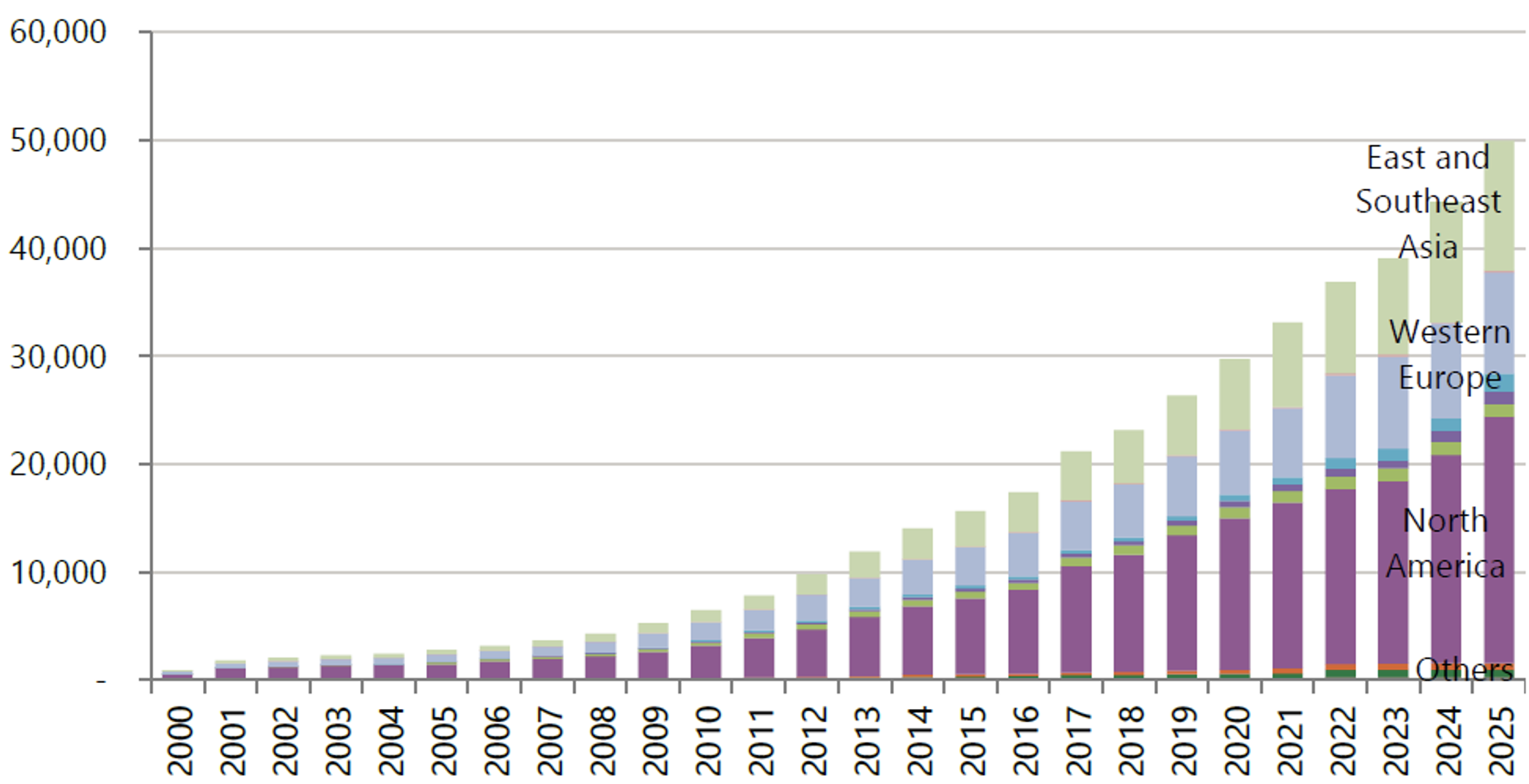 Globale IT-Leistungskapazität von Rechenzentren, 2000-2025, in Megawatt (MW):