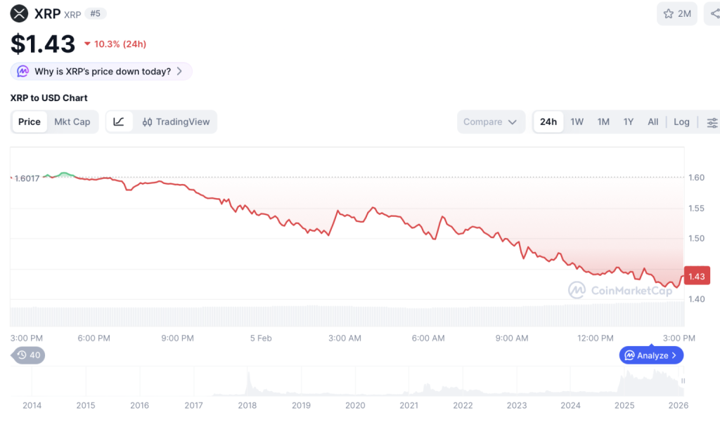 XRP gehört derzeit zu den schwächsten großen Kryptowährungen. Innerhalb von 24 Stunden verlor der Token rund zehn Prozent an Wert und fiel zeitweise auf etwa 1,43 US-Dollar. Damit entwickelte sich XRP deutlich schwächer als viele andere Top-10-Assets, was die Diskussion über eine mögliche Ausweitung der Korrektur neu entfacht hat.