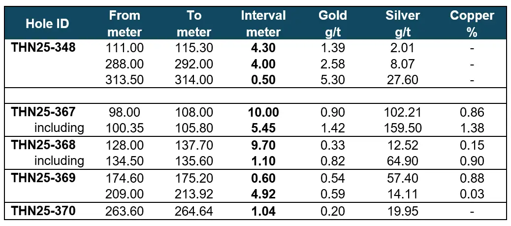 Ausgewählte interessante Abschnitte in den Bohrlöchern THN25-348 bei Trapper und den Bohrlöchern THN25-367, THN25-368, THN25-369 und THN25-370 bei Camp Creek; Brixton Metals