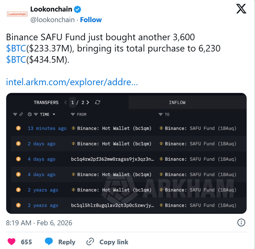 Trotz des schwachen Marktumfelds sorgt Binance mit gezielten Bitcoin-Käufen für Aufmerksamkeit. Analysen zeigen, dass der SAFU-Fonds der Börse zuletzt mehrere tausend Bitcoin erworben hat. Insgesamt summieren sich die jüngsten Zukäufe auf über 6.000 Bitcoin mit einem Gegenwert von mehreren hundert Millionen US-Dollar.