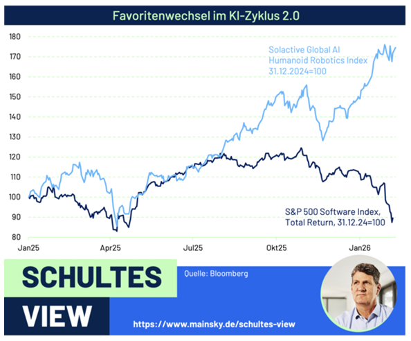 Die Disruption durch den KI-Zyklus wirbelt die Aktienmärkte massiv durcheinander. Wer als Anleger jetzt noch auf statische oder rein passive Strategien wie einen MSCI-World-ETF setzt, läuft Gefahr, den Anschluss zu verlieren.Software-Aktien im freien Fall Im Softwarebereich schlägt die disruptive Kraft der KI voll zu. Ehemals unantastbare Software-as-a-Service(SaaS)-Größen wie ServiceNow, HubSpot oder Adobe verzeichnen im laufenden Jahr 2026 Kursabschläge von bis zu 40 Prozent. Der S&P-500-Software-Index hat im laufenden Jahr rund 20 Prozent verloren und befindet sich nah an seinen Tiefs vom letzten April.Das Ende der Mag7-Einheit Die Zeit, in der die "Magnificent 7" geschlossen den Markt nach oben gezogen haben, ist vorbei. Während 2023 und 2024 noch alle sieben Titel den S&P 500 outperformten, fragmentiert der Markt zusehends. 2025 schlugen nur noch Alphabet und Nvidia den Index. In diesem Jahr liegen lediglich die Google-Mutter und der "Non-AI-Player" Apple vorn. Die Bewertungen sind hoch, der Capital-Expenditure(CapEx)-Zyklus ist weit fortgeschritten und die Monetarisierung der gigantischen Investitionen wird zurecht hinterfragt. Historisch gesehen haben Aktienkurse ihren Peak oft erreicht, bevor der CapEx-Gipfel überschritten wurde - das Kurspotenzial scheint hier also vorerst ausgeschöpft.Die neuen Profiteure Der KI-Boom ist keineswegs vorbei, er verlagert sich nur. Die neuen Gewinner sind die Unternehmen, in die die massiven Ausgaben der Tech-Giganten fließen. Das betrifft nicht nur Halbleiter, sondern vor allem die Profiteure der "KI-Knappheiten": Energieinfrastruktur, Thermomanagement und optische Komponenten. Auch sind Unternehmen abseits des IT-Sektors interessant, die durch die Anwendung von AI ihre Effizienz und damit Rentabilität steigern. Das große Zukunftsthema im KI-Zyklus 2.0 sollte aber "Physical AI" werden. Damit sind Systeme gemeint, die nicht nur Daten verarbeiten, sondern ihre physische Umgebung wahrnehmen und Aufgaben erledigen, wie z.B. humanoide Roboter. So liegt der Solactive AI Humanoid Robotics Index in diesem Jahr mit 20 % im Plus und bildet damit den Gegenpol zu den Software-Verlierern.Was bedeutet das für Investoren? Wer auf statischen Strategien beharrt, hat kaum eine Chance, von diesen rasanten Umwälzungen zu profitieren. Ein MSCI-World-ETF bildet die Gewinner der Vergangenheit ab, nicht die der Zukunft. Investoren sollten diese massiven strukturellen Marktveränderungen frühzeitig erkennen und strukturell im Portfolio abbilden. Wir nutzen im MainSky Macro Allocation Fund die Flexibilität unseres Ansatzes, um das Kapital in die Sektoren und Themen zu steuern, die den neuen Zyklus dominieren.