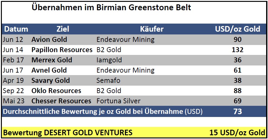 Es wird auf einem Blick schnell klar wie brisant die Unterbewertung von DESERT GOLD VENTURES bezogen auf die Übernahmetransaktionen in diesem Gebiet sind. Die günstigsten Übernahmen fanden bislang bei einer Bewertung von 36 USD/oz Gold und die teuersten Übernahmen bei 132 USD/oz Gold statt. Im Durchschnitt ergibt sich eine Bewertung bei Übernahmen je Unze Gold von 73 USD.