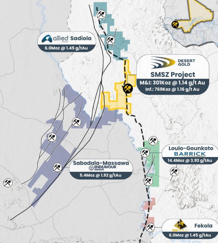 Die Nachbarschaft rund um die 440 Quadraktilometer umfassende SMSZ-Liegenschaft von Desert Gold in Mali liest sich wie ein Who-is-Who der Branche und kann sich damit mehr als sehen lassen. Zahlreiche Vorkommen und bereits aktive Goldminen befinden sich in nahezu direkter Schlagdistanz. Darunter z.B: Loulo (Barrick Mining) mit 9,8 Mio. Unzen Gold, Fekola (B2 Gold) mit 7,6 Mio. Unzen Gold oder Sadiola (Allied Gold) mit 7,3 Mio. Unzen Gold.