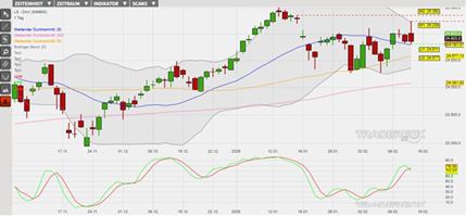 Der DAX befindet sich in einem langfristigen Aufwärtstrend, welcher am 13. Januar durch den Ausbruch auf neue Höchststände bestätigt wurde. Anschließend ist der Index in eine Konsolidierung eingetreten. In dieser Woche konnte dabei eine neue Aufwärtsbewegung eingeleitet werden, welche den Index bis zum 12. Februar temporär in den überkauften Bereich über das obere Bollinger-Band geführt hat. Es folgte eine technische Gegenreaktion, welche wiederum ein Verkaufssignal in der Slow Stochastik ausgelöst hat. Es wurde getriggert, als die grüne Signallinie des Oszillators unter die rote Signallinie gesunken ist. Die Kaufsignale der gleitenden Durchschnitte der letzten 20, 50 sowie 200 Börsentage (= GD 20, GD 50 sowie GD 200) sind derweil weiterhin intakt. Infolgedessen könnte der Index nach einer temporären Konsolidierung eine Fortsetzung des Aufwärtstrends forcieren. In diesem Szenario markiert das Tageshoch vom 12. Februar bei 25.239 Punkten (Widerstand 1) die erste Hürde. Der Kursanstieg über dieses Hindernis könnte wiederum Anschlusskäufe bis zum Tageshoch vom 16. Januar bei 25.350 Punkten (Widerstand 2) begünstigen. Impulse erwarten die Marktteilnehmer heute insbesondere durch den Verbraucherpreisindex aus den USA, bevor dann am Montag in den USA ein Feiertag stattfinden wird. Vorbörslich wird der DAX mit einem Kursanstieg von +0,2 % getaxt. Das Long-Szenario ist hinfällig, wenn der DAX unter die Marke von 24.577 Punkten (Unterstützung 2) fällt