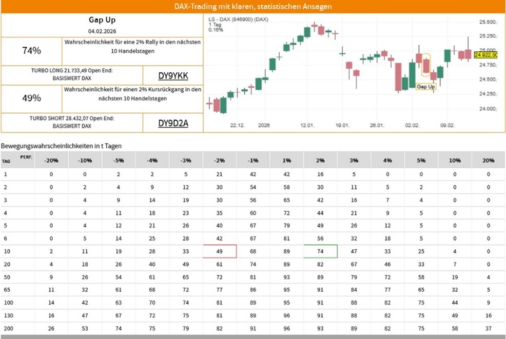 Die Erfolgswahrscheinlichkeiten für das Signal "Gap Up" beruhen auf einer historischen Auswertung des Signals auf den LS-DAX im Zeitraum vom 02.01.2000 bis zum 12.02.2026. Dabei wurden die folgenden Voreinstellungen und Filter vorgenommen: