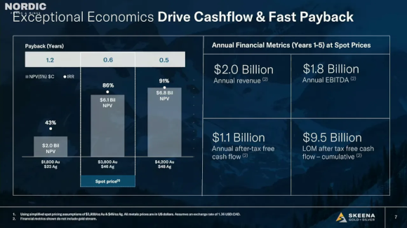 Skeena Gold & Silver ( ISIN: CA83056P7157 - WKN: A3CRER) ist - laut Management - voll finanziert für den Bau. Letzten Sommer sicherte sich das Unternehmen Zusagen von rund C$1 Mrd. von Orion Resource Partners, während die initiale Capex-Schätzung bei C$765 Mio. liegt. Das heißt: Das Projekt ist überkommittiert, die Eigenkapitalkomponente minimiert (geringe Verwässerung).
