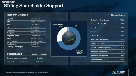 Aktuell sind rund 65% institutionalisiert, große Mining-Fonds halten Positionen, dazu ein bedeutender Generalist-Investor. Die ausstehenden Aktien liegen bei ~120 Mio. (inkl. jüngster Finanzierungsrunden). Einige Banken und Analysten notieren Kursziele (z. B. CIBC: C$36), die an die Erreichung von Genehmigungen gekoppelt sind.