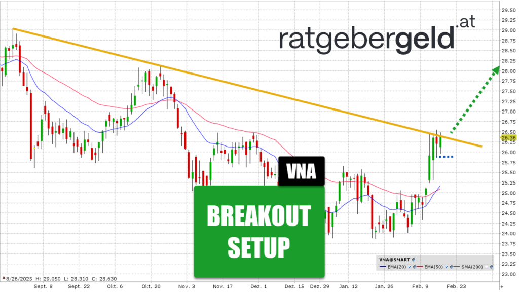 In den letzten Tagen haben die Bullen versucht die Abwärtstrendlinie zu überwinden. Ein signifikanter Widerstand liegt im Bereich von 26.50 Euro. Erst ein nachhaltiger Ausbruch über diese Marke würde den Weg in Richtung des Oktober-Hochs ebnen.