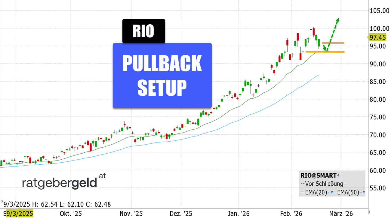 Rio Tinto ist als einer der Big Player bei den Basismaterialien sowohl geografisch als auch hinsichtlich der Rohstoffe bestens aufgestellt und partizipiert an der aktuellen Rallye. Nach einem tödlichen Arbeitsunfall hat der britisch-australische Konzern sein Schlüssel-Eisenerzprojekt Simandou in Guinea vorläufig gestoppt. Die Untersuchungen laufen, während ein zentraler Wachstumstreiber pausiert und gleichzeitig schwache Eisenerzpreise auf die Stimmung drücken. Charttechnisch sieht alles intakt aus, allerdings läuft die Rallye bei den Rohstoffen schon sehr lange, sodass ein solcher Vorfall durchaus eine Sektorrotation in Gang setzen könnte.
