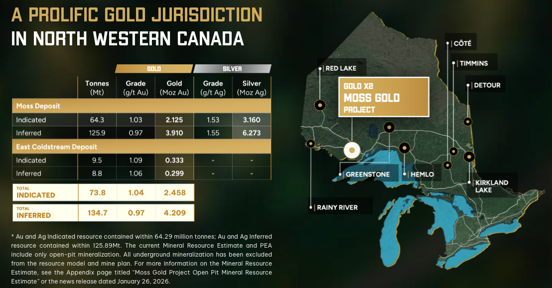 Erst Ende Januar des laufenden Jahres hat Gold X2 Mining Inc. (WKN: A41GPN) bedeutende Ergebnisse seiner Preliminary Economic Assessment (PEA) und seiner aktualisierten Mineralressourcenschätzung (MRE) für sein unternehmenseigenes Moss Gold-Projekt in Nordwest-Ontario, Kanada veröffentlicht! Diese Meldungen sind das, was man allgemeinhin einenMeilenstein nennt. Denn hierdurch wurde das immense wirtschaftliche Potenzial des Projekts nochmals deutlich unterstrichen und zugleich die nächste Phase der Projektreife eingeläutet.
