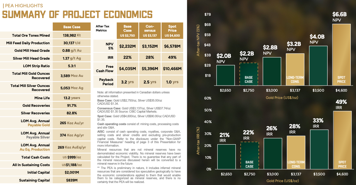 Die PEA, erstellt in Übereinstimmung mit den kanadischen NI 43-101-Standards, zeigt robuste wirtschaftliche Kennzahlen selbst unter konservativen Annahmen, wie im Basisfall. Dieser legt einen Goldpreis von gerade einmal 2.750 USD pro Unze und einen Silberpreis von 35 USD pro Unze zugrunde, woraus sich schon ein nach Steuern Nettobarwert (NPV 5%) von rund 2,23 Milliarden CAD ergibt, bei einer internen Verzinsung (IRR) von 22,1%. Die Kapitalrückflusszeit liegt dabei bei rund 3,2 Jahren.