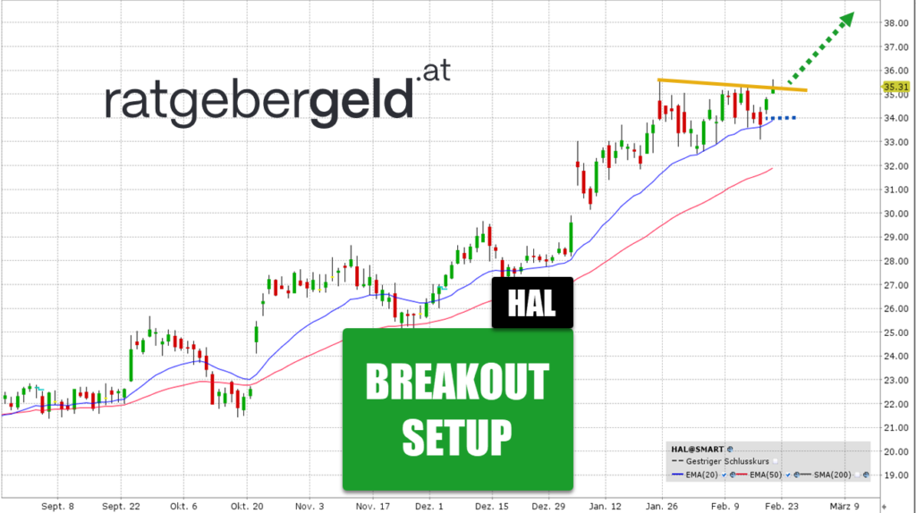 Die Halliburton-Aktie startete im Oktober eine dynamische Rallye, die den Kurs von rund 22 US-Dollar bis auf über 35 US-Dollar katapultierte. Seit Ende Januar konsolidiert der Titel nun auf hohem Niveau direkt unter einem markanten Widerstandsbereich. Auffällig ist, dass die Aktie die 20-Tagelinie als dynamische Unterstützung nutzt und dort immer wieder Käufer findet.