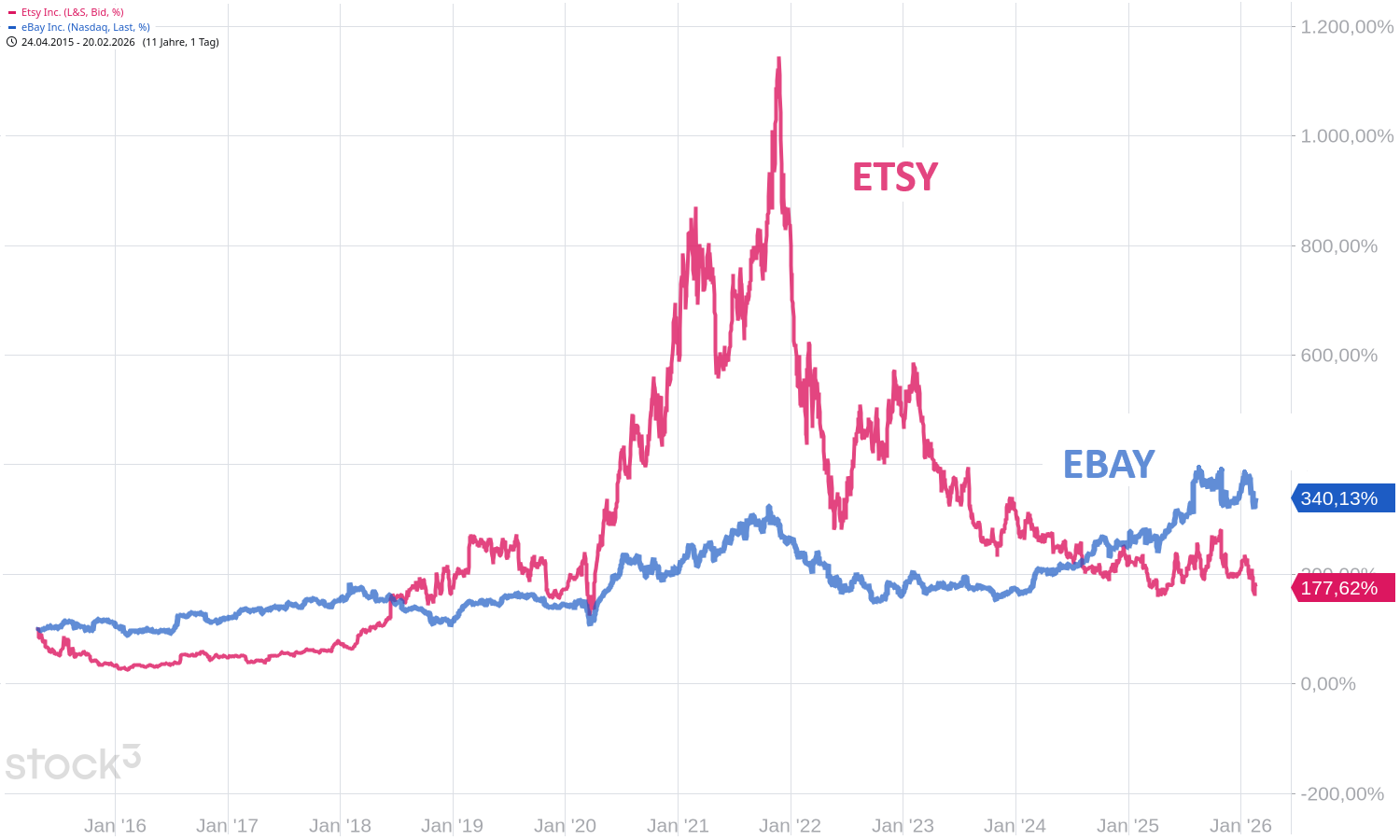 Der Onlinemarktplatzbetreiber aus Brooklyn bzw. New York wurde gestern für das Zahlenwerk mit insgesamt fast 11 % Kursplus auf 48,91 $ belohnt. Als Börsenwert wird aktuell 4,8 Mrd. $ angezeigt. Eine hohe Summe und trotzdem Schatten der Vergangenheit: Ende 2022 notierte die ETSY-Aktie über 290 $. Schon die Erkenntnis, dass die Zinsen wieder steigen müssen, reichte damals als Endsignal für die (teils coronabedingte) Kursrally.