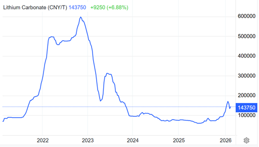 Durch den Boom der E-Mobilität und in Zukunft auch Energiespeicherung verschlingt China Unmengen an Lithium. So prognostizierte Li Liangbin, Vorsitzender von Ganfeng Lithium, im November 2025, dass die Nachfrage für Lithium in 2026 um 30-40% ansteigen sollte. Das chinesische Unternehmen Ganfeng Lithium ist einer der größten Lithium-Konzerne der Welt.