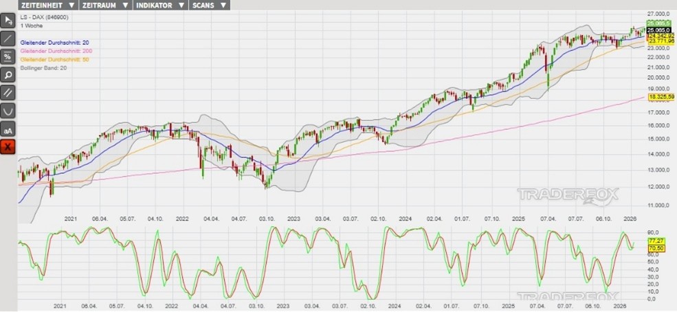 Eine Trendfortsetzung könnte den Index in den kommenden Tagen in Richtung des Allzeithochs vom 13. Januar bei 25.510 Punkten (Widerstand 1) tendieren lassen. Der Ausbruch auf neue Höchststände würde wiederum ein prozyklisches Kaufsignal erzeugen, welches weitere Kursanstiege bis zur psychologischen Barriere bei 26.000 Punkten (Widerstand 2) auslösen könnte. Als eine Anlagemöglichkeit in den DAX stehen verschiedene derivative Produkte zur Verfügung. Ein Beispiel ist der ENDLOS TURBO LONG 22.798,37 OPEN END: BASISWERT DAX der DZ BANK (WKN: DU7RFS)* mit einem Basispreis von 22.798,37 Punkten. Der Hebel liegt am 23.02.2026 um 07:00 Uhr bei rund 10,30. Das Long-Szenario ist hinfällig, wenn der DAX nachhaltig unter die Unterstützung bei 24.730 Punkten (Unterstützung 2) fällt. Bitte beachten Sie die Produktrisiken, welche unten im Dokument beschrieben sind.
