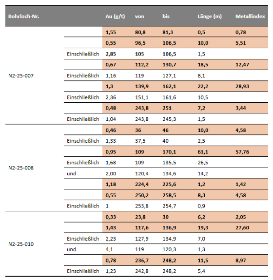- N2-25-011: 166,8 Meter Zielmineralisierung ab 60,0 Metern Downhole - ebenfalls mit wiederholten breiten Abschnitten, teils bis 70,6 Meter
