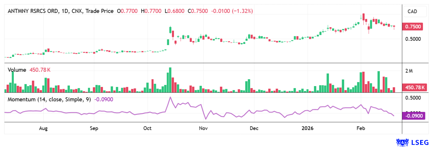 Die Aktie von Antimony Resources hat in den letzten 6 Monaten gezeigt, was Knappheit im Aktienkurs bedeuten kann. Der Kurs konnte sich von rund 0,10 CAD auf über 0,80 CAD bewegen. Eine fantastische Rally, die in den Anfängen dem Chart von Almonty Industries ähnelt. Quelle: LSEG vom 24.02.2026