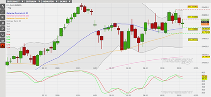 Der langfristige Aufwärtstrend konnte am 13. Januar durch den Kursanstieg auf neue Höchststände bestätigt werden. Anschließend wurde eine Konsolidierung eingeleitet, welche wiederum die Basis für die nächste Aufwärtswelle legen könnte. In der letzten Woche wurde dabei eine Aufwärtsbewegung bis temporär in den überkauften Bereich über das obere Bollinger-Band eingeleitet, bevor an den letzten beiden Tagen jeweils sinkende Tageshochs und -tiefs eine technische Gegenreaktion erzeugt haben. Hierbei wurde in der Slow Stochastik ein belastendes Verkaufssignal getriggert. Die Kaufsignale der gleitenden Durchschnitte der letzten 20, 50 sowie 200 Börsentage (= GD 20, GD 50 sowie GD 200) sind derweil weiterhin intakt. Infolgedessen könnte der Index durch die Etablierung eines neuen Verlaufstiefs potenziell die Basis für die Fortsetzung des übergeordneten Aufwärtstrends legen. In diesem Szenario markiert das Tageshoch vom 24. Februar bei 25.093 Punkten (Widerstand 1) die erste Hürde. Der Kursanstieg über dieses Hindernis könnte wiederum Anschlusskäufe bis zum oberen Bollinger-Band und dem Verlaufshoch vom 20. Februar bei 25.340 Punkten (Widerstand 2) begünstigen. Impulse erwarten die Anleger heute unter anderem durch die Daten zum Bruttoinlandsprodukt und GfK Konsumklima für Deutschland. Vorbörslich wird der DAX mit einem Kursanstieg von +0,1 % getaxt. Das Long-Szenario ist hinfällig, wenn der DAX unter die Marke von 24.730 Punkten (Unterstützung 2) fällt.