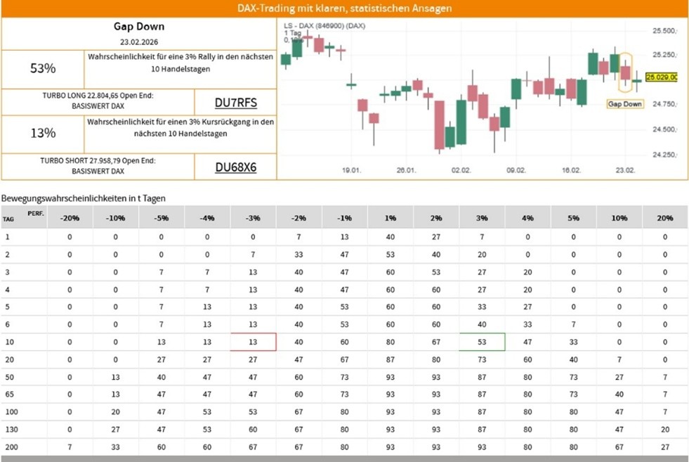 Die Erfolgswahrscheinlichkeiten für das Signal "Gap Down" beruhen auf einer historischen Auswertung des Signals auf den LS-DAX im Zeitraum vom 02.01.2000 bis zum 24.02.2026. Dabei wurden die folgenden Voreinstellungen und Filter vorgenommen: