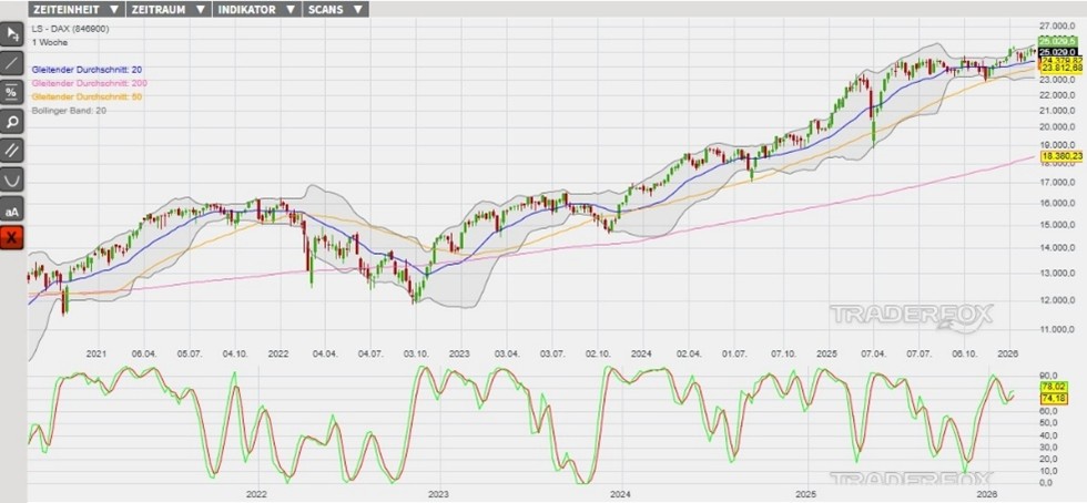 Charttechnisch könnte eine neue Aufwärtswelle den Index wieder in Richtung des oberen Bollinger-Bandes tendieren lassen. In diesem Szenario markiert das Tageshoch vom 24. Februar bei 25.093 Punkten (Widerstand 1) die erste Barriere. Der Kursanstieg über dieses Hindernis könnte Anschlusskäufe bis zum Verlaufshoch vom 20. Februar bei 25.340 Punkten (Widerstand 2) auslösen. Als eine Anlagemöglichkeit in den DAX stehen verschiedene derivative Produkte zur Verfügung. Ein Beispiel ist der ENDLOS TURBO LONG 22.804,65 OPEN END: BASISWERT DAX der DZ BANK (WKN: DU7RFS)* mit einem Basispreis von 22.804,65 Punkten. Der Hebel liegt am 25.02.2026 um 07:00 Uhr bei rund 11,15. Das Long-Szenario ist hinfällig, wenn der DAX nachhaltig unter die Unterstützung bei 24.730 Punkten (Unterstützung 2) fällt. Bitte beachten Sie die Produktrisiken, welche unten im Dokument beschrieben sind.