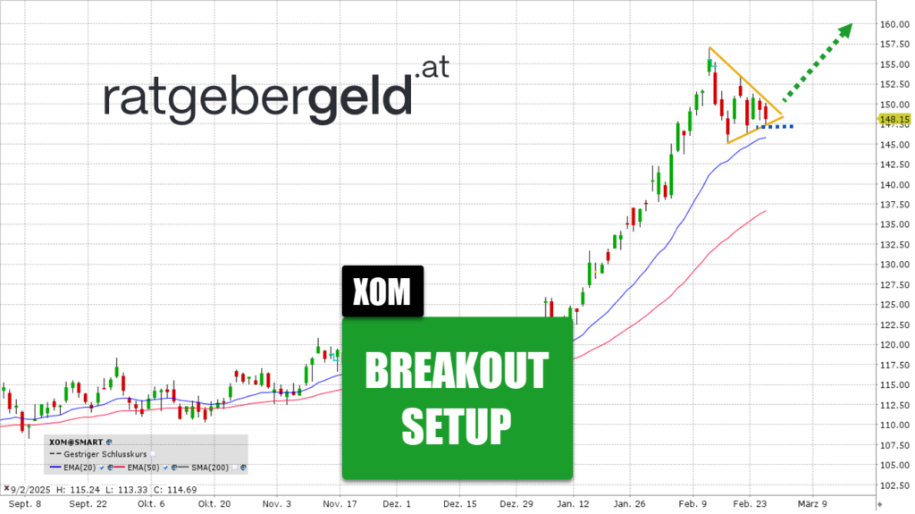 Seit November 2025 sieht man einen massiven Aufwärtstrend bei der Öl-Aktie. Das Papier hat sich von etwa 115 US-Dollar auf fast 160 US-Dollar hochgearbeitet. Dabei liegen die Kerzen sauber über dem EMA 20. Aktuell bildet die Aktie ein enges Dreieck am oberen Ende der Fahnenstange.