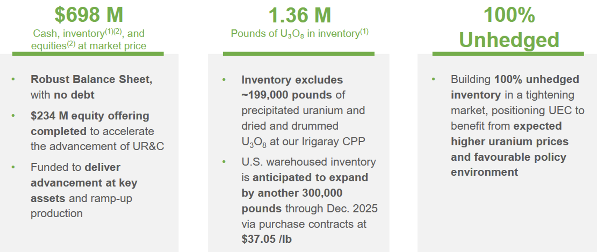 Uranium Energys (WKN: A0JDRR) smarter opportunistischer "Unhedged'-Ansatz sorgt für maximale Hebelwirkung des Uranpreises: Verkäufe in der ersten Jahreshälfte und eine bewusste Auffüllung des Lagerbestands im zweiten Teil des Jahres erlauben dem Unternehmen, maximal von steigenden Uranpreisen zu profitieren.