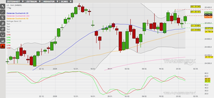 Im Szenario einer Fortsetzung des Aufwärtstrends markiert das Tageshoch vom 25. Februar bei 25.187 Punkten (Widerstand 1) die erste Barriere. Der Kursanstieg über dieses Hindernis könnte Anschlusskäufe bis zum oberen Bollinger-Band und dem Verlaufshoch vom 20. Februar bei 25.340 Punkten (Widerstand 2) auslösen. Als eine Anlagemöglichkeit in den DAX stehen verschiedene derivative Produkte zur Verfügung. Ein Beispiel ist der ENDLOS TURBO LONG 22.807,79 OPEN END: BASISWERT DAX der DZ BANK (WKN: DU7RFS)* mit einem Basispreis von 22.807,79 Punkten. Der Hebel liegt am 26.02.2026 um 07:00 Uhr bei rund 10,46. Das Long-Szenario ist hinfällig, wenn der DAX nachhaltig unter die Unterstützung bei 24.882 Punkten (Unterstützung 2) fällt. Bitte beachten Sie die Produktrisiken, welche unten im Dokument beschrieben sind.