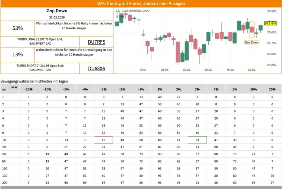 Die Erfolgswahrscheinlichkeiten für das Signal "Gap Down" beruhen auf einer historischen Auswertung des Signals auf den LS-DAX im Zeitraum vom 02.01.2000 bis zum 25.02.2026. Dabei wurden die folgenden Voreinstellungen und Filter vorgenommen: