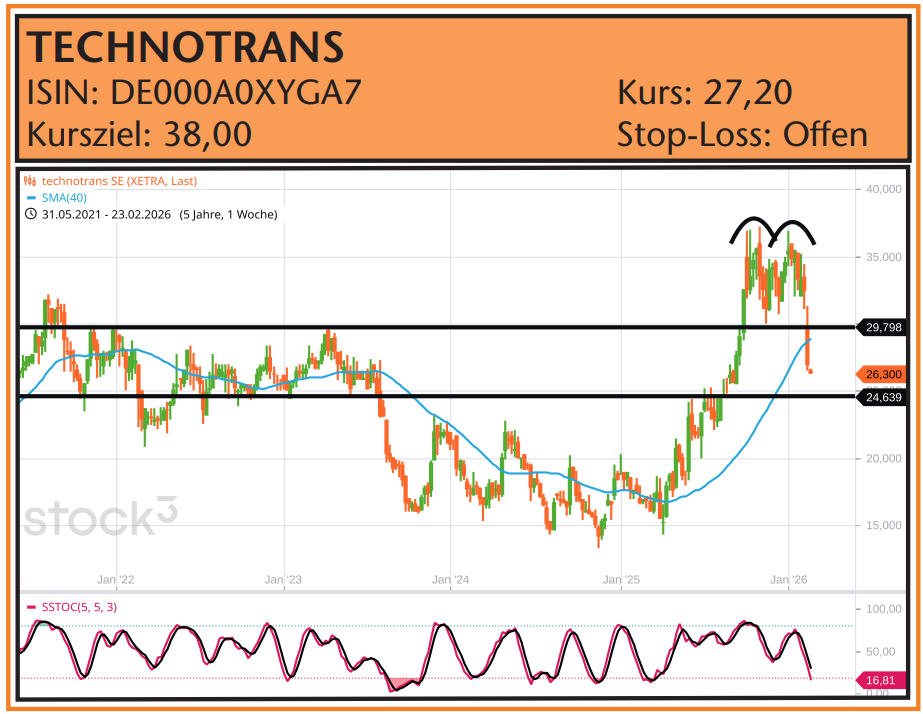 Das Unternehmen hat das Übergangsjahr 2025 mit einer deutlich verbesserten Profitabilität abgeschlossen, auch wenn die Zurückhaltung im Kunststoffsektor den Umsatz mit 244 Mio. € knapp unter die Ziellinie drückte. Das sorgt im Kurs für Missstimmung. Das eigentliche Prunkstück der Bilanz ist die Kapitalrendite (ROCE), die mit 16,8 % die eigene Prognose pulverisierte und zeigt, wie schlank der Konzern mittlerweile aufgestellt ist. Der Fokus verschiebt sich nun massiv in Richtung "Energy Management": Mit innovativen Lösungen für die Flüssigkeitskühlung von KI-Rechenzentren sitzt TECHNOTRANS direkt an der Schnittstelle zum Megatrend der KI. Mehrere Großaufträge im Bereich Datacenter untermauern das Book-to-Bill-Ratio von 1,1 und sichern die Auslastung für 2026 ab. Nun kommt es auf das endgültige Zahlenwerk am 24. März nebst frischen Auftragsdaten und den Ausblick auf 2026 an. Der Titel bleibt bis dahin haltenswert.