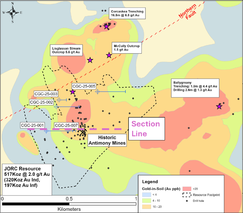 The objective of the hole was to enhance the geological understanding of the system and assess the potential for higher-grade, structurally controlled mineralisation at depth. The Clontibret gold target exhibits several key geological features analogous to the high-grade Fosterville Gold Mine in Victoria, Australia (current endowment >10 Moz), indicating the potential for multi-million-ounce gold mineralisation at depth. This drill hole achieved its objective of intersecting more than 10 identified lodes. Assay results from the bottom of the drill hole showed that the drill hole was within a gold mineralised zone before it was stopped due to technical difficulties encountered during a re-entry at a depth of approximately 150m following a change of drill bit, as announced by the Company on 26 February 2026. The hole had already reached ca. 415m but had not yet reached its target depth in the stockwork zone. A new deep hole, CGC-25-007, has been permissioned and is being drilled to directly target the stockwork zone informed by the observations in CGC-25-001.