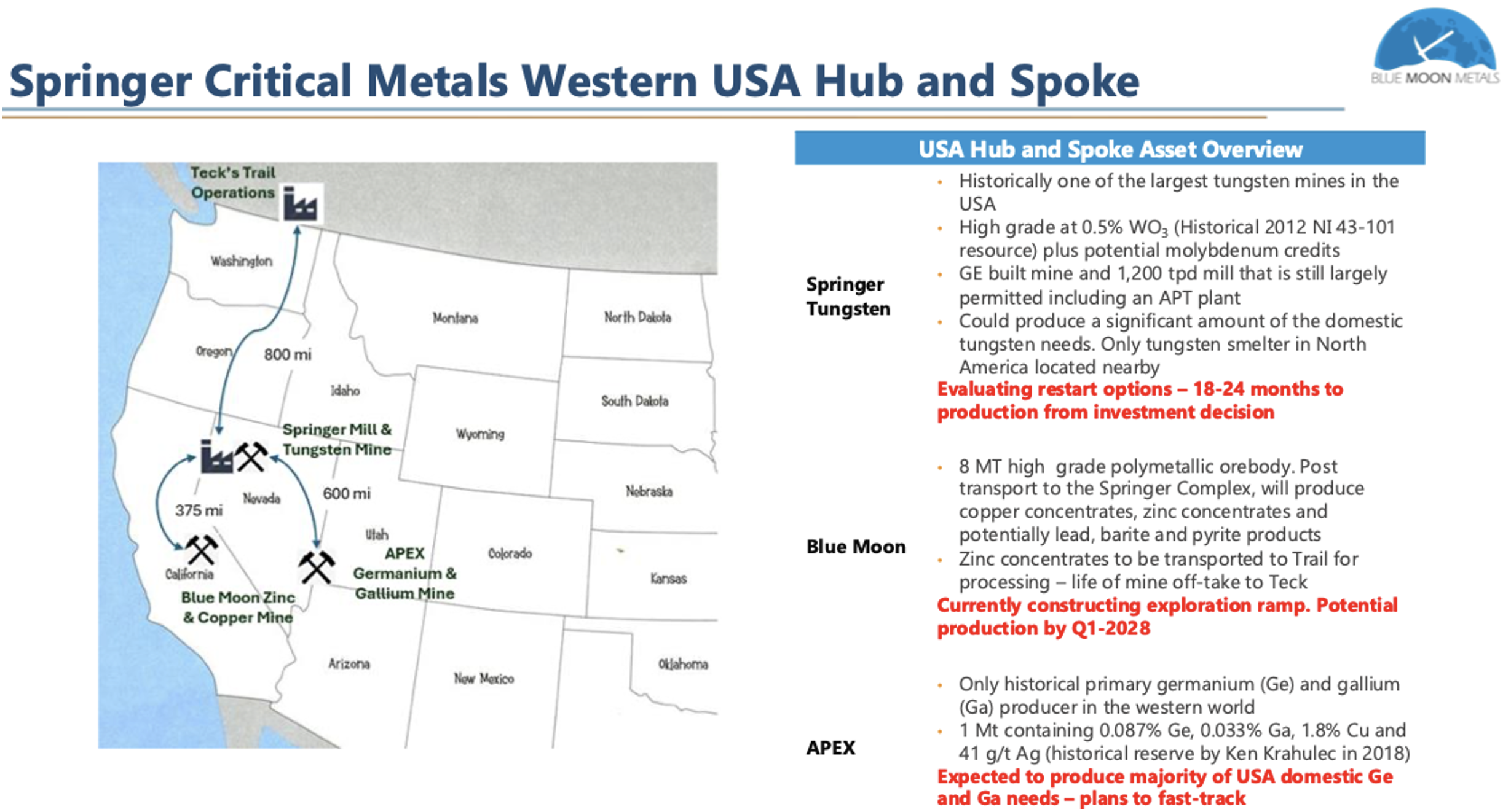 Parallel dazu schreitet die Entwicklung der Blue Moon-Mine in Kalifornien planmäßig voran. Mit bereits erteilten Genehmigungen, laufender Untertageerschließung und dem Ziel einer Produktion ab 2028 verfügt das Projekt über das Potenzial, über mehr als ein Jahrzehnt stabile Produktionsmengen an Gold, Zink, Silber und Kupfer zu liefern. Die Verarbeitung dieser Rohstoffe soll im firmeneigenen Springer-Komplex erfolgen, der als regionales Zentrum für kritische Mineralien ausgebaut wird.